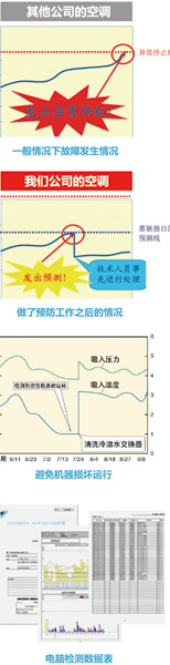 預(yù)防性工作一般包括 系統(tǒng)點檢就是將外機通過特有接口轉(zhuǎn)接到電腦上,在機器運行平穩(wěn)后通過專有軟件得到機器運行的所有參數(shù),將這些參數(shù)與正常運行值進行比較,找到其中的異常. 排查是根據(jù)點檢結(jié)果展現(xiàn)的異常趨勢判斷可能出現(xiàn)的問題,然后逐一排查確認.包括對系統(tǒng)的初始設(shè)計、工程安裝做重新審查. 修復(fù)包括機組的維修、系統(tǒng)大修和進行必要的改造,包括機組的使用建議等,以確保有系統(tǒng)能夠在長期平穩(wěn)運行.這就需要維保有單位不但要有清洗能力,還要具體維修、設(shè)計和安裝的能力. 大修是指是預(yù)防性定期維護保養(yǎng)服務(wù)之一.大修涉及對有異常現(xiàn)象的設(shè)備部分進行拆卸和檢修.檢測空調(diào)設(shè)備的損耗情況,并提供改進方案,并及時更換原廠配件. 對于較大的項目,通常工作步驟為:勘查現(xiàn)場,了解現(xiàn)狀->確定工作內(nèi)容->清洗、修復(fù)、點檢->交付維保報書