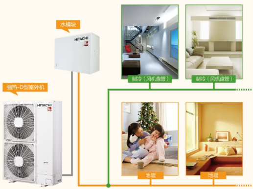 日立地暖+中央空調一體化系統,是采用空氣源熱泵技術,和中央空調共用一臺室外機,只是在整個系統中間增加了一個水模塊,用來提升水溫,最后將熱水輸送到地暖盤管內,加熱地板,從而達到地板輻射取暖的目的。